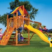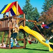 5′ 4″ and 7′ 2″ deck heights, 10.5′ high swing beam, 270° spiral slide and 10.5′ scoop slide