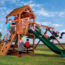 5′ deck height, 24 sq feet deck area, 8′ swing beam height, 10′ slide