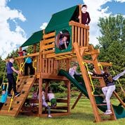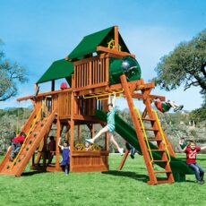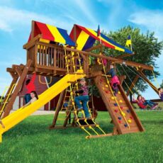 5′ deck height, 24sq feet main deck + penthouse, 8′ swing beam height, 10′ slide