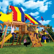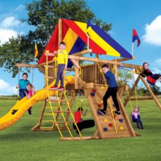 5′ 2″ deck height, 8.5′ high swing beam, 10′ slide + 270° spiral slide