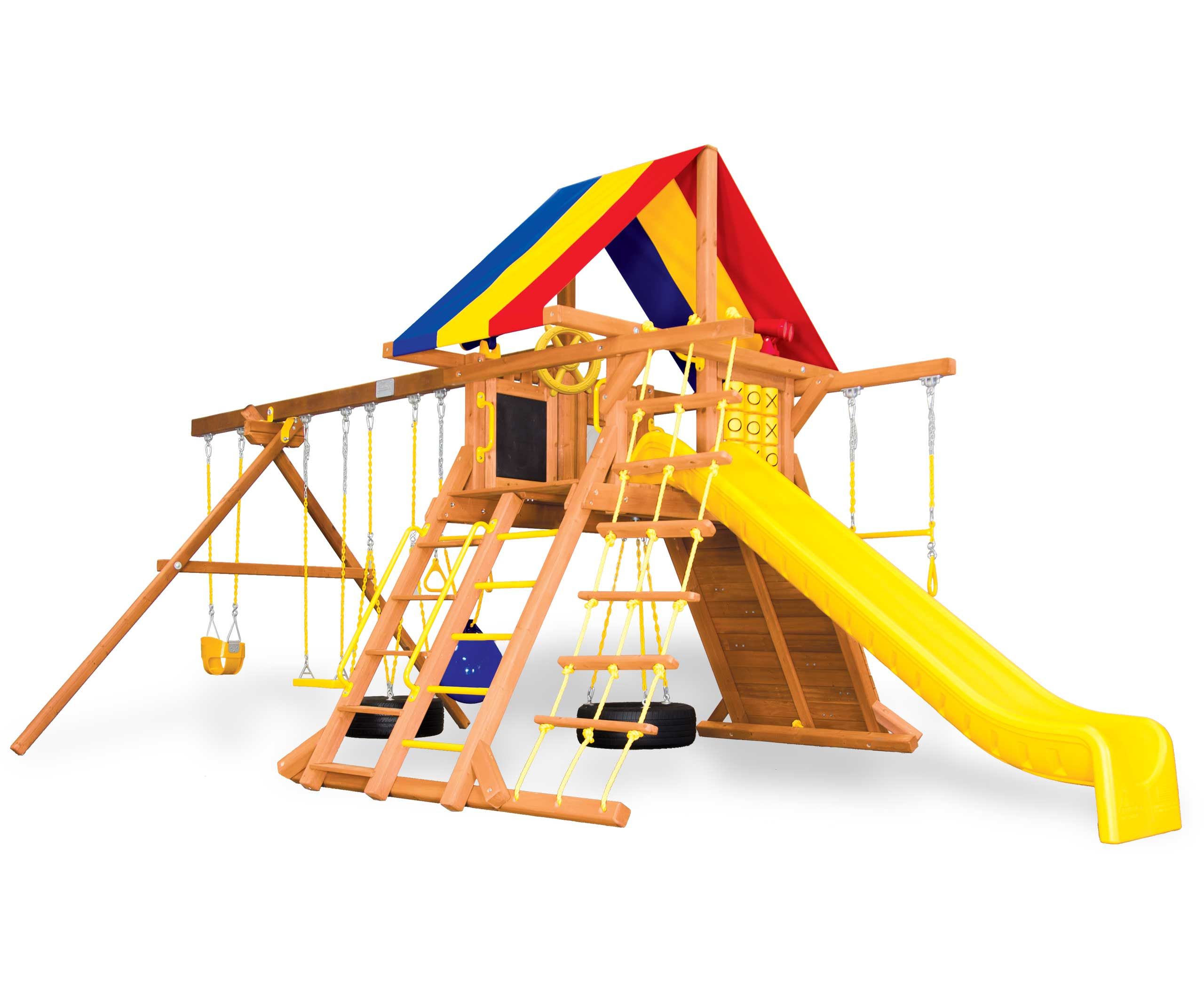 5′ deck height, 24 sq feet deck area, 8′ swing beam height, 10′ slide