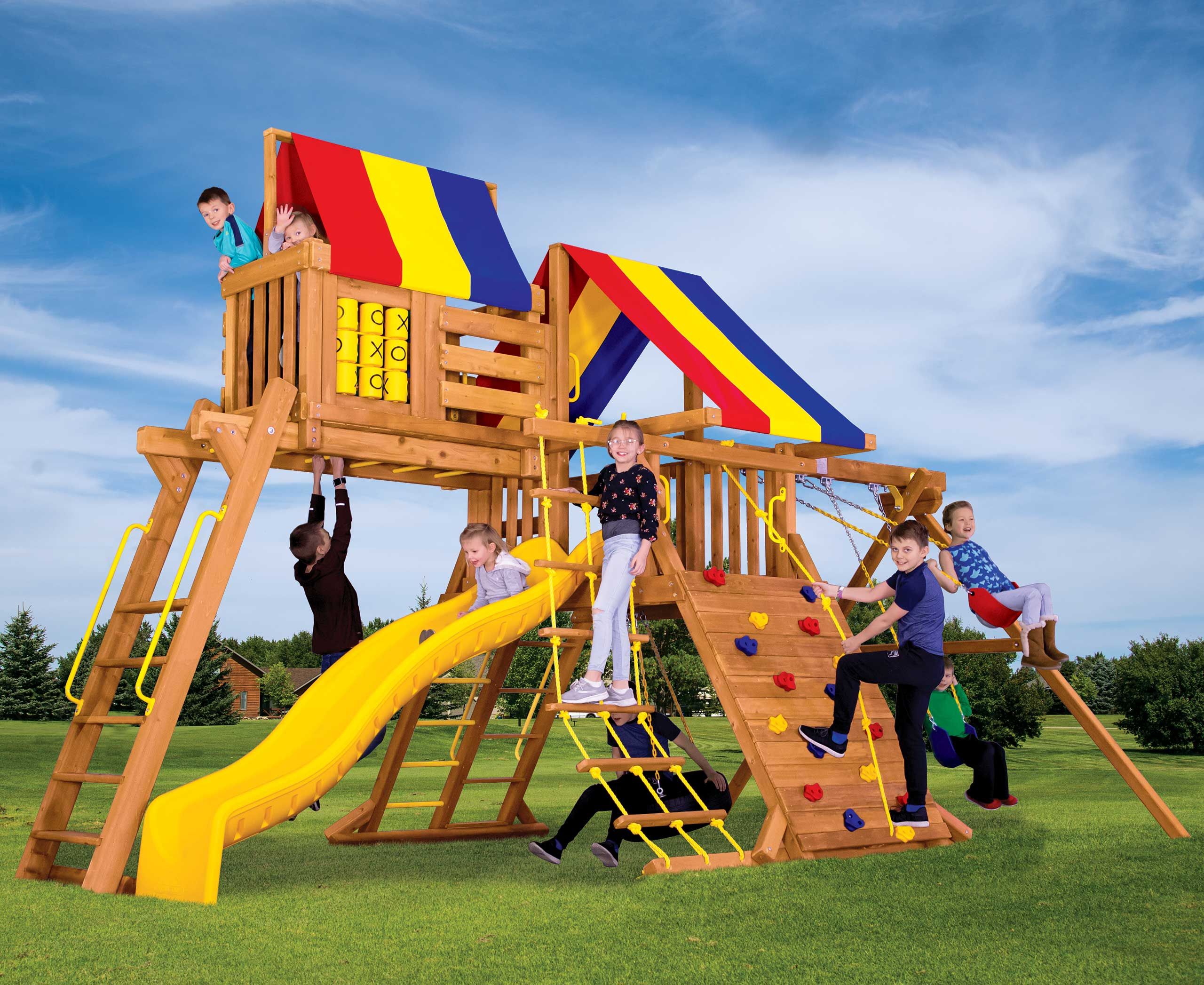 5′ deck height, 24sq feet main deck + penthouse, 8′ swing beam height, 10′ slide