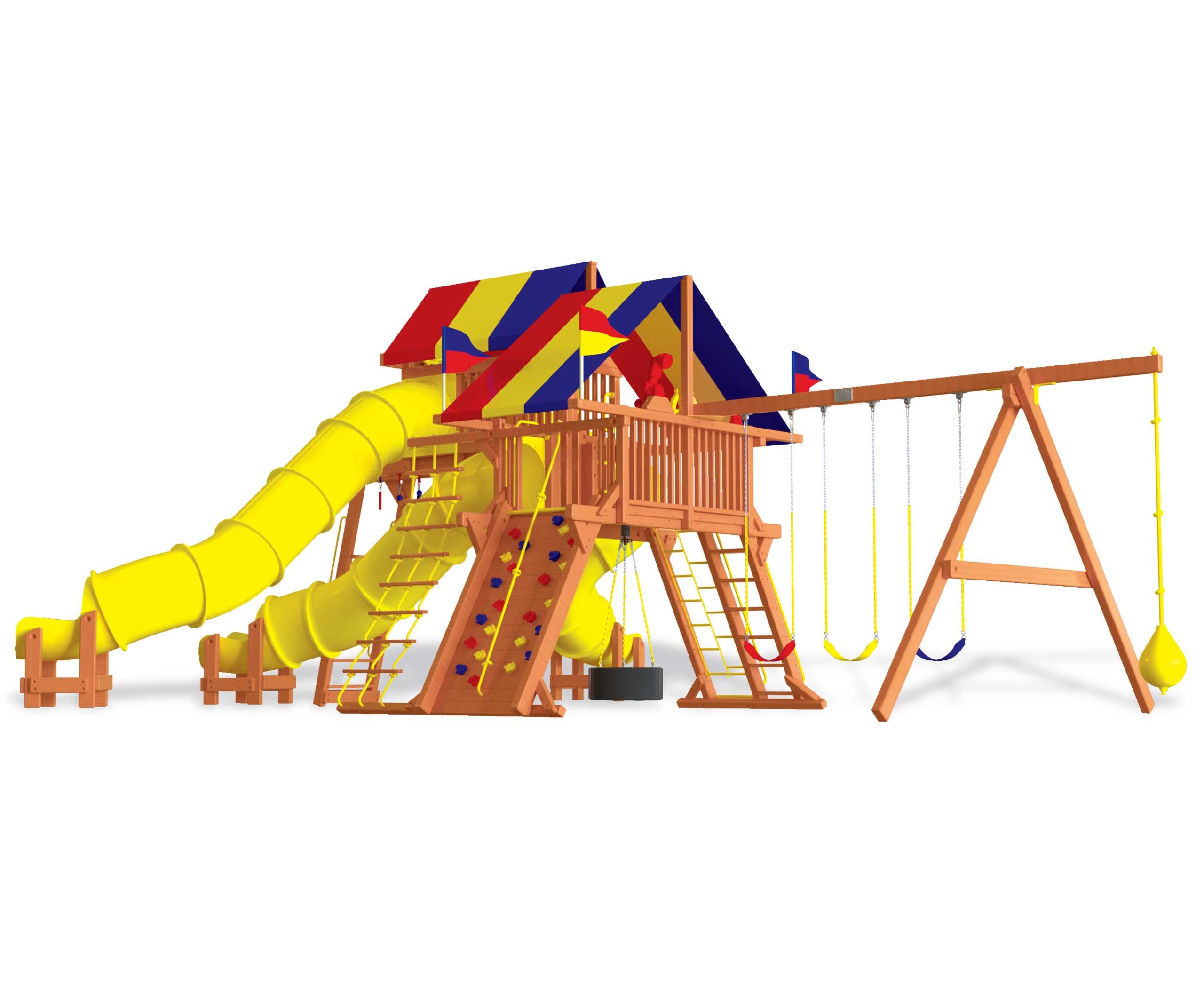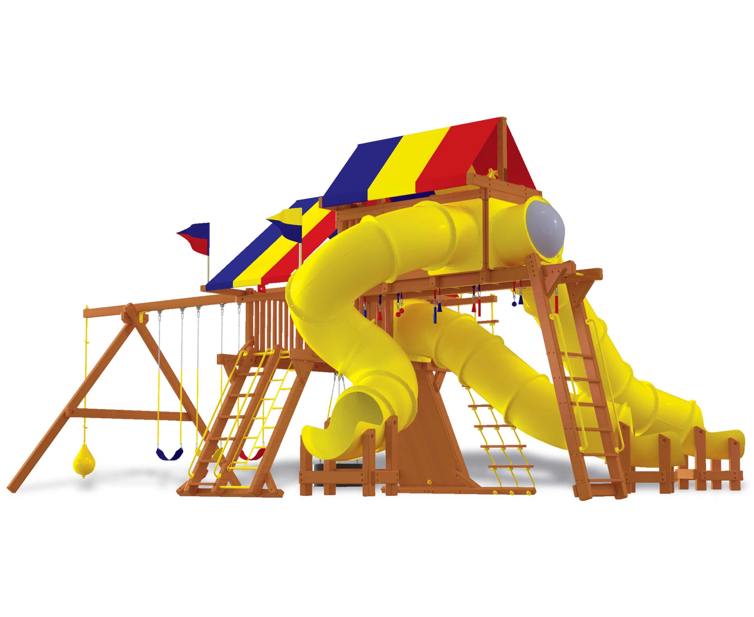 6′ deck height, 9.25′ high swing beam, 3 tube slides