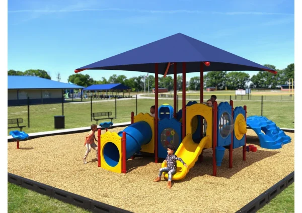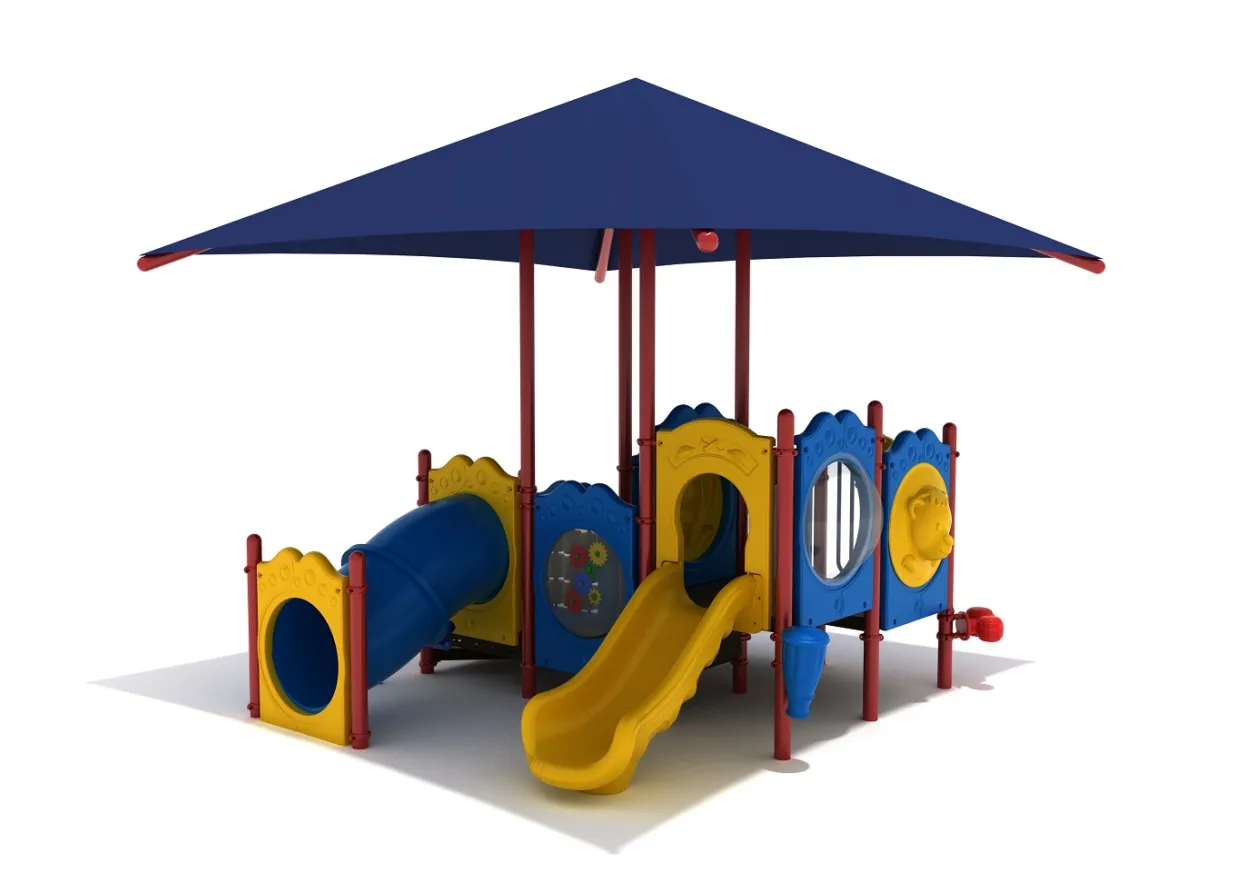 We all know how quickly the sun can drain kids’ energy and prevent them from playing to their heart’s content. However, with the Monument Views in your playground, the sun stands no chance in slowing them down. It has a tall, built-in shade that keeps kids cool and comfortable so they can play longer, even when the sun is at its peak. And unlike traditional play structures with high stairs and steep climbs, Monument Views is built with toddlers in mind. It features low platforms that are easy for even the tiniest feet to step onto. There’s also an adventurous route up through the Incline Tube Bridge. On the highest deck, kids will be greeted with a Straight Slide that offers a quick ride down. Kids can also challenge friends to a game of Tic-Tac-Toe on the Tic Tac Toe Panel or explore how machines work with the Gear Panel. On the ground, kids will be drawn to the Single Drum and Bongo Drums. There’s also a Rain Wheel that makes a soothing sound when spun.