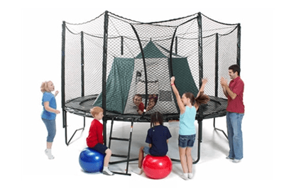 It’s great for daytime adventures or sleepovers the tent can sleep 4 or 5 ten year olds comfortably. It has zippered and netted/screened doors and windows, a full floor, double-stitched seams and easily attaches to the AlleyOop Safety Enclosure in less than 5 minutes. There are no poles used in this patent pending safety-conscious design; the tent is suspended with bungee cords to the top and bottom of the safety enclosure.