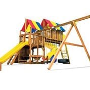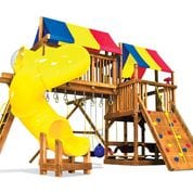5′ 8″ deck height, 9′ high swing beam, 10.5′ slide + 360° spiral slide