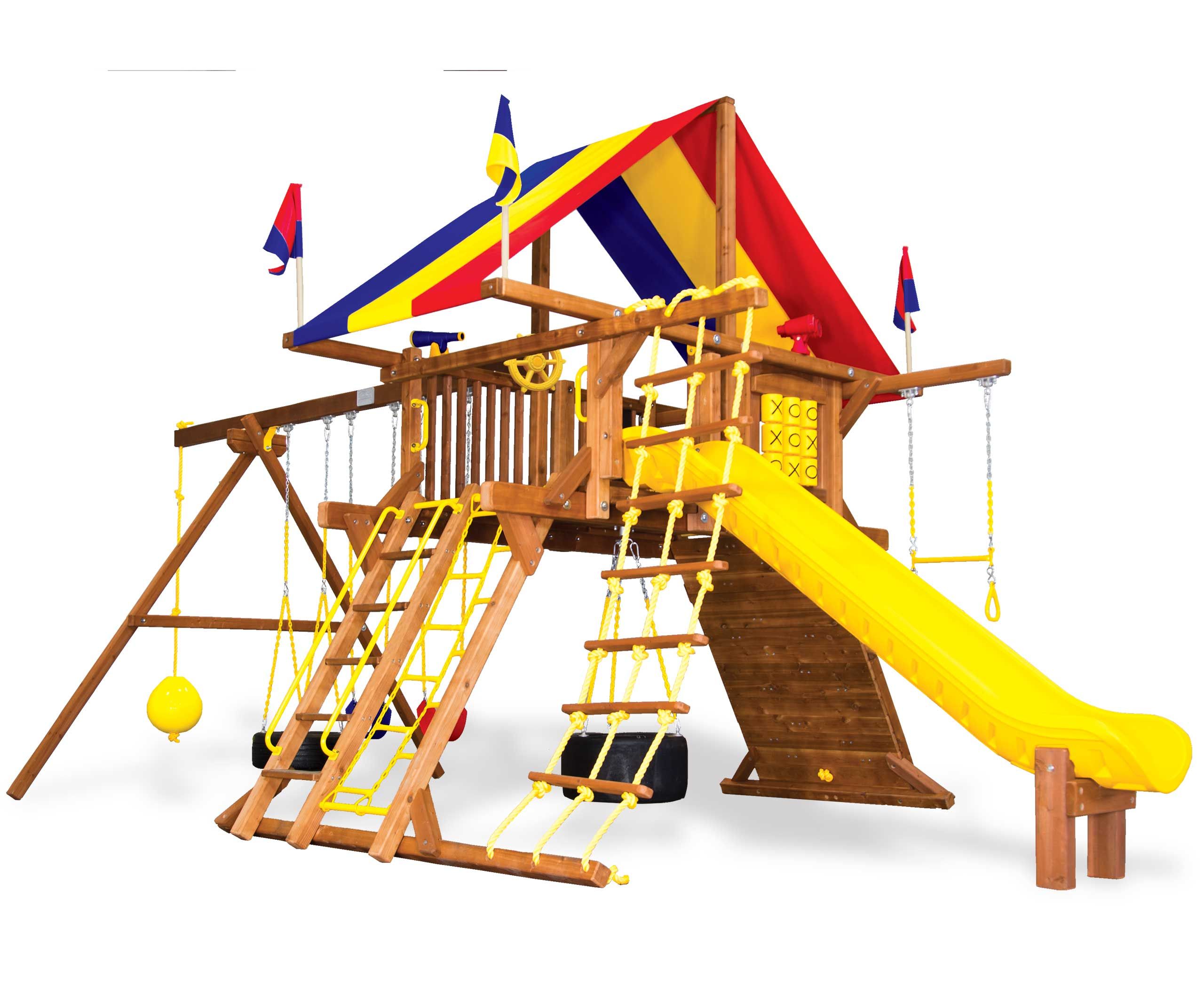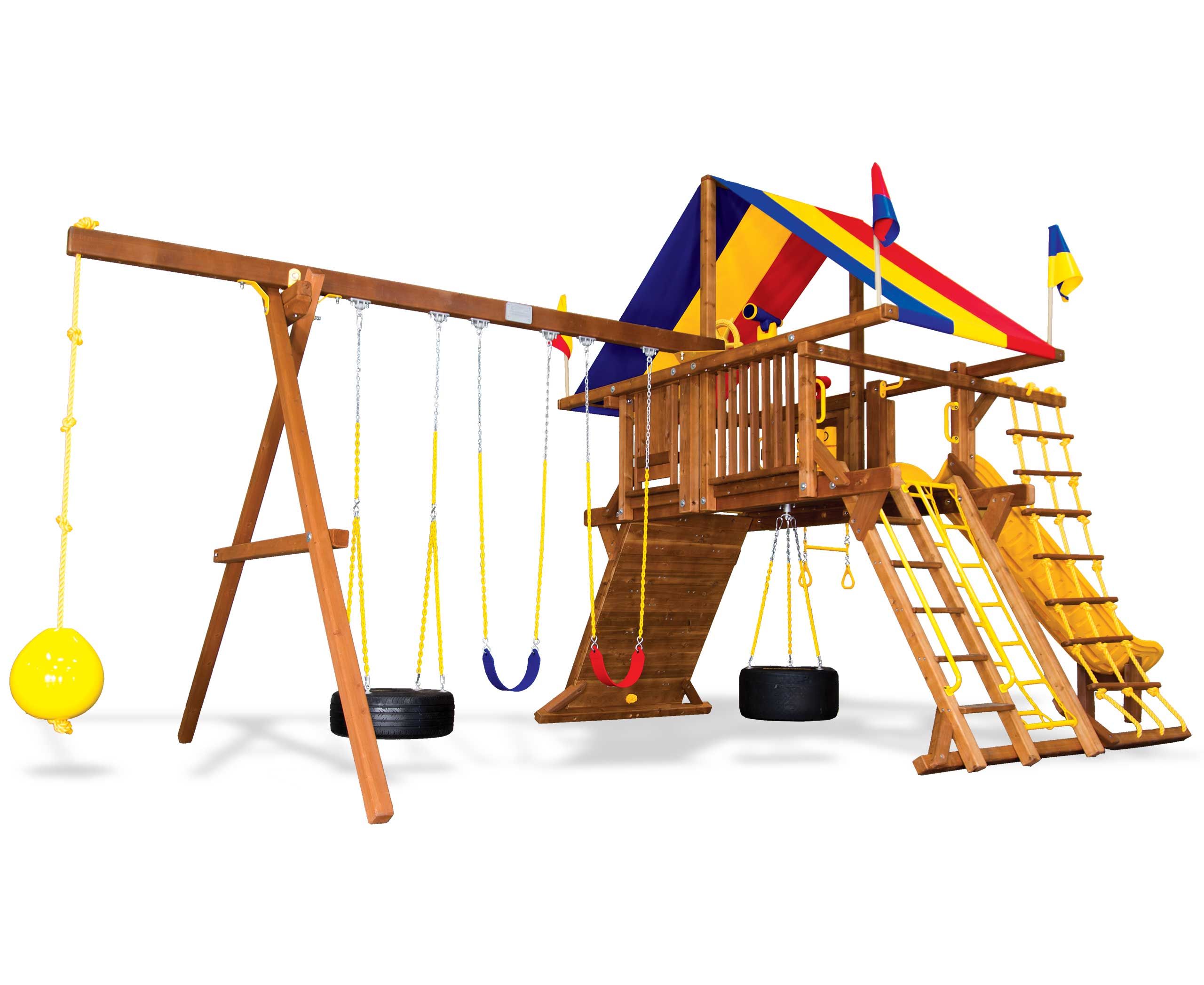 5′ 8″ deck height, 9′ high swing beam, 10.5′ slide