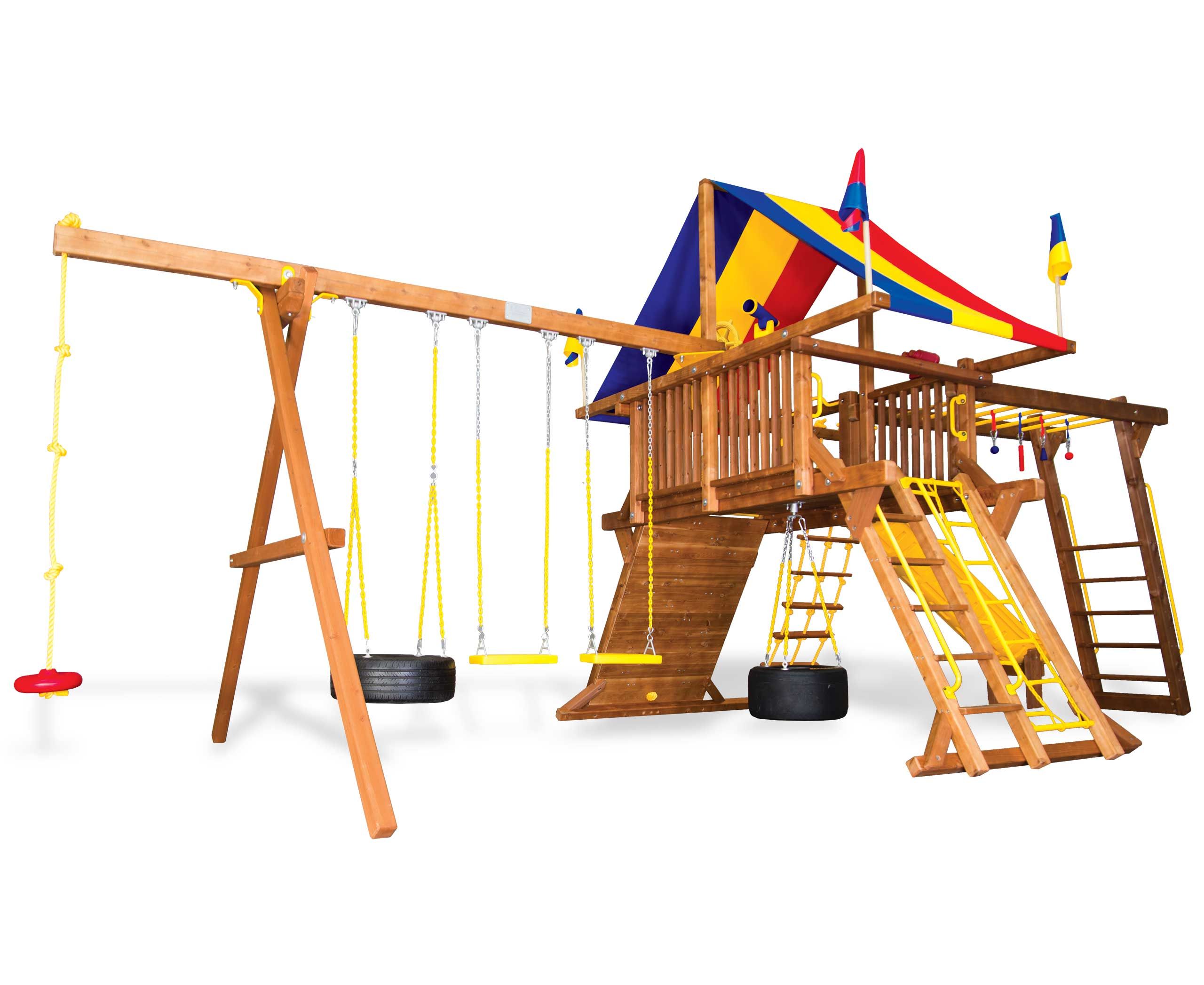 5′ 8″ deck height, 9′ high swing beam, 10.5′ slide